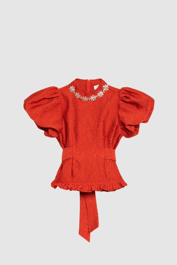 Ayarlanabilir bel bağcığıyla kendi tarzınızı şekillendirmenizi sağlayan bu minik çiçek desenli jakarlı bluz, ilk bakışta hikâyesini anlatmaya başlar. Fırfırlı etek ucu ve mücevher detaylı yaka ise tasarıma masalsı bir ışıltı katar.
